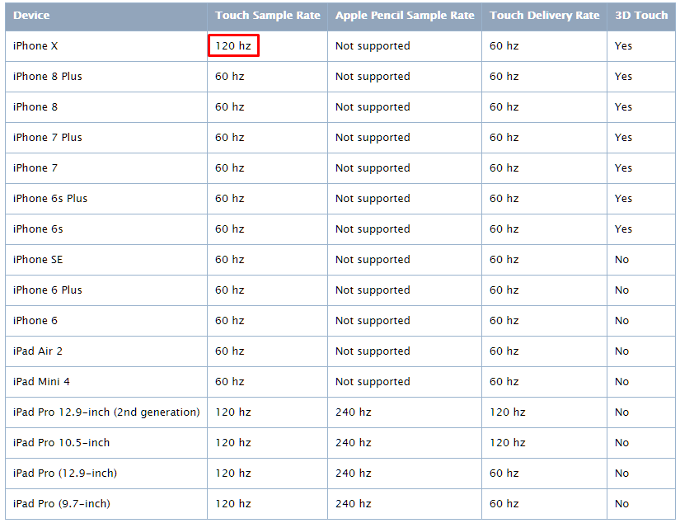 Trên thực tế màn hình của iPhone X có tần số quét 120 Hz không "xịn" bằng dòng iPad Pro 2017. Có nghĩa là máy vẫn thuộc dạng tiêu chuẩn với tần số quét 60 Hz (Touch Delivery Rate) tuy nhiên tần số quét tương tác màn hình (Touch Sample Rate) đã được đẩy lên 120 Hz nhờ ProMotion.