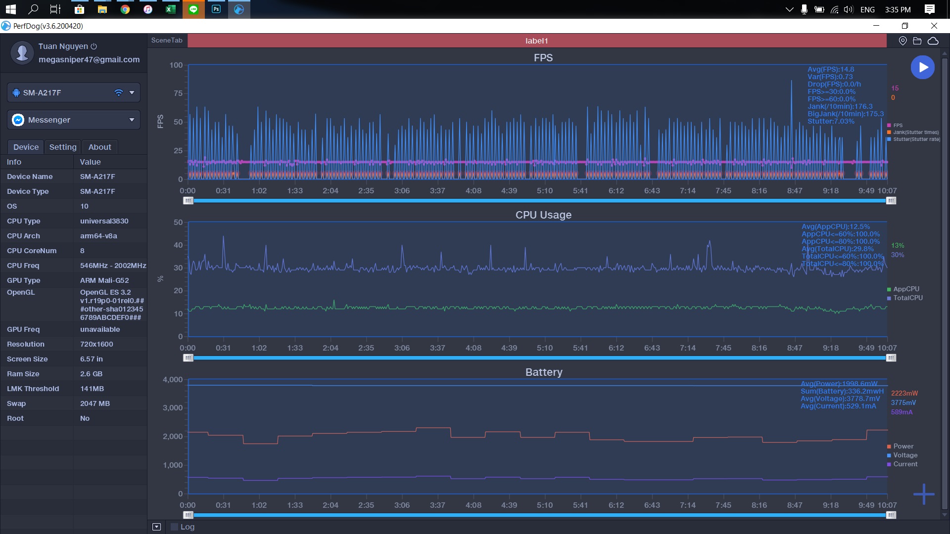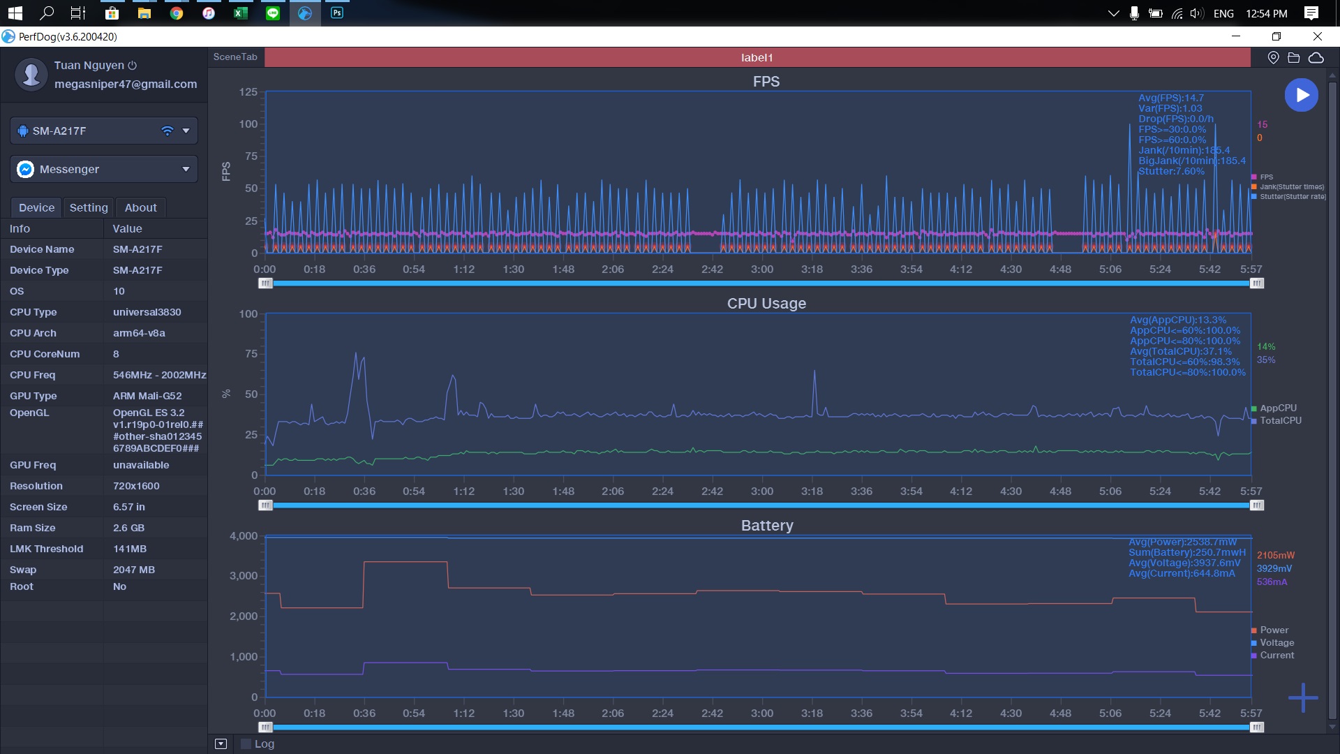 Để đánh giá thời lượng pin Galaxy A21s, mình sử dụng phần mềm PrefDog để đo đạc, kết hợp cùng với sự tính toán cho các số liệu thu được. Các bạn có thể xem toàn bộ data mình chụp ảnh màn hình từ PrefDog ở bên dưới.