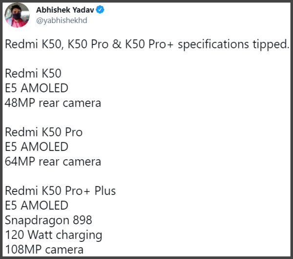 Leaker Abhishek Yadav dẫn thông tin từ một số nguồn đáng tin cậy ở Trung Quốc, cho biết Redmi K50 sẽ được trang bị camera chính 48 MP phía sau và dùng màn hình AMOLED E5 - đây là màn hình có trên iQOO 8 Pro và Vivo X70 Pro Plus.