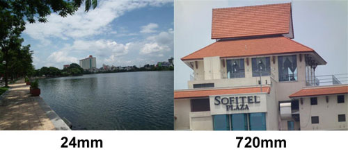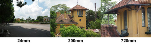 Ảnh so sánh tiêu cự 24mm, 200mm và 720mm. |