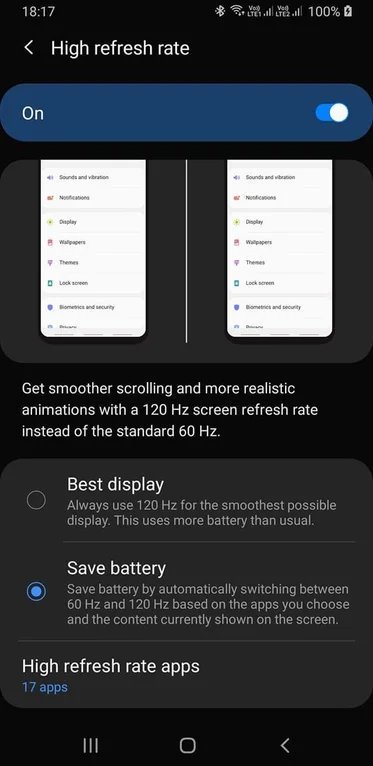 Màn hình 120 Hz mang đến độ mượt mà hơn hẳn so với 60 Hz, nhất là khi chơi game (nhiều game di động hiện nay đã hỗ trợ màn hình 120 Hz). Tuy nhiên, màn hình 120 Hz lại "ngốn" pin hơn, nên Samsung đã đưa thêm vào One UI 2.0 tùy chọn 60 Hz để người dùng linh động trong việc sử dụng trong các trường hợp.