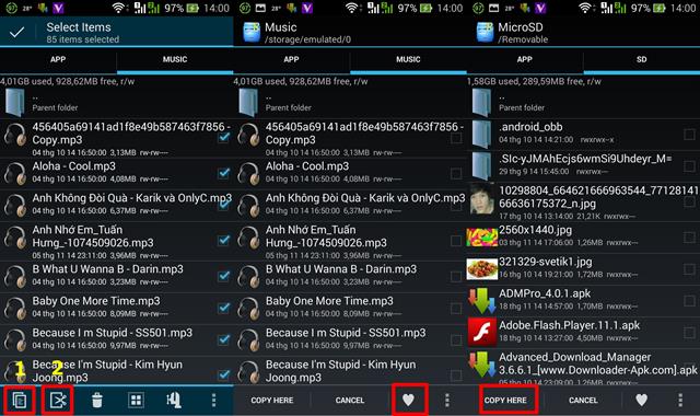 Vào thư mục chứa nhạc > chạm giữ bài hát cần chuyển khoảng 1s > tick vào ô bài nhạc cần chuyển > nếu chọn (1) là sao chép và (2) là di chuyển > chạm biểu tượng trái tim để chọn đường dẫn đến thẻ nhớ > copy here