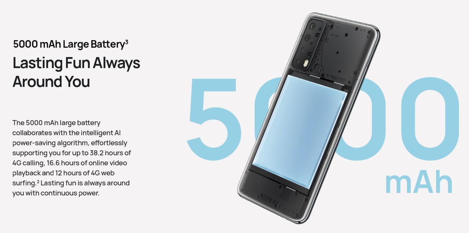 Không chỉ được tích hợp pin 5.000 mAh, Huawei Y7a còn hỗ trợ sạc nhanh 22.5 W. Các thông số kỹ thuật khác của điện thoại bao gồm 4G VoLTE kép, Wi-Fi 802.11ac, Bluetooth 5.1, USB-C, cổng âm thanh 3.5 mm và cảm biến vân tay đặt ở khung cạnh bên.