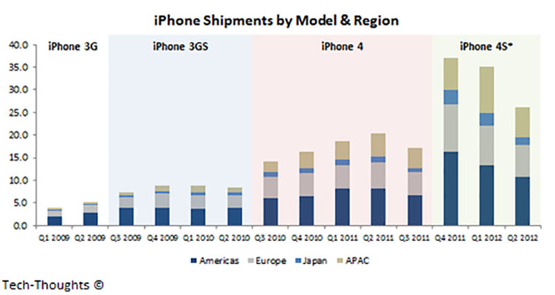 Điển hình như iPhone 4 những tưởng sẽ bị quay lưng với vụ anntenagate, nhưng sau đó thì Apple đã tung ra thị trường được tới gần 87 triệu chiếc chỉ trong 1 năm. Chi tiết hơn về số lượng iPhone 4 từ quý 3/2010 tới quý 3/2011 được thể hiện trong biểu đồ sau.