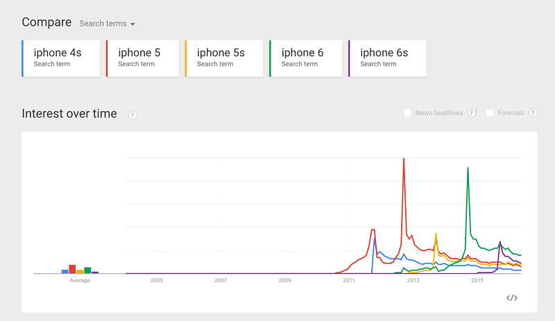 Tiếp tục nhìn vào bảng đồ thị thống kê chi tiết từ Google Trends về xu hướng của người dùng đối với các thế hệ iPhone kế tiếp nhau trong vòng năm năm qua. Hãy để ý rằng iPhone 6 tạo ra mức độ phấn khích thấp hơn so với iPhone 5, iPhone 6s và iPhone 5s cũng có tương quan như vậy. Điều đó chứng tỏ rằng càng ngày, chiến lược 1 phiên bản mới kèm 1 phiên bản nâng cấp nhẹ của Apple càng giảm sút hiệu quả theo thời gian.
