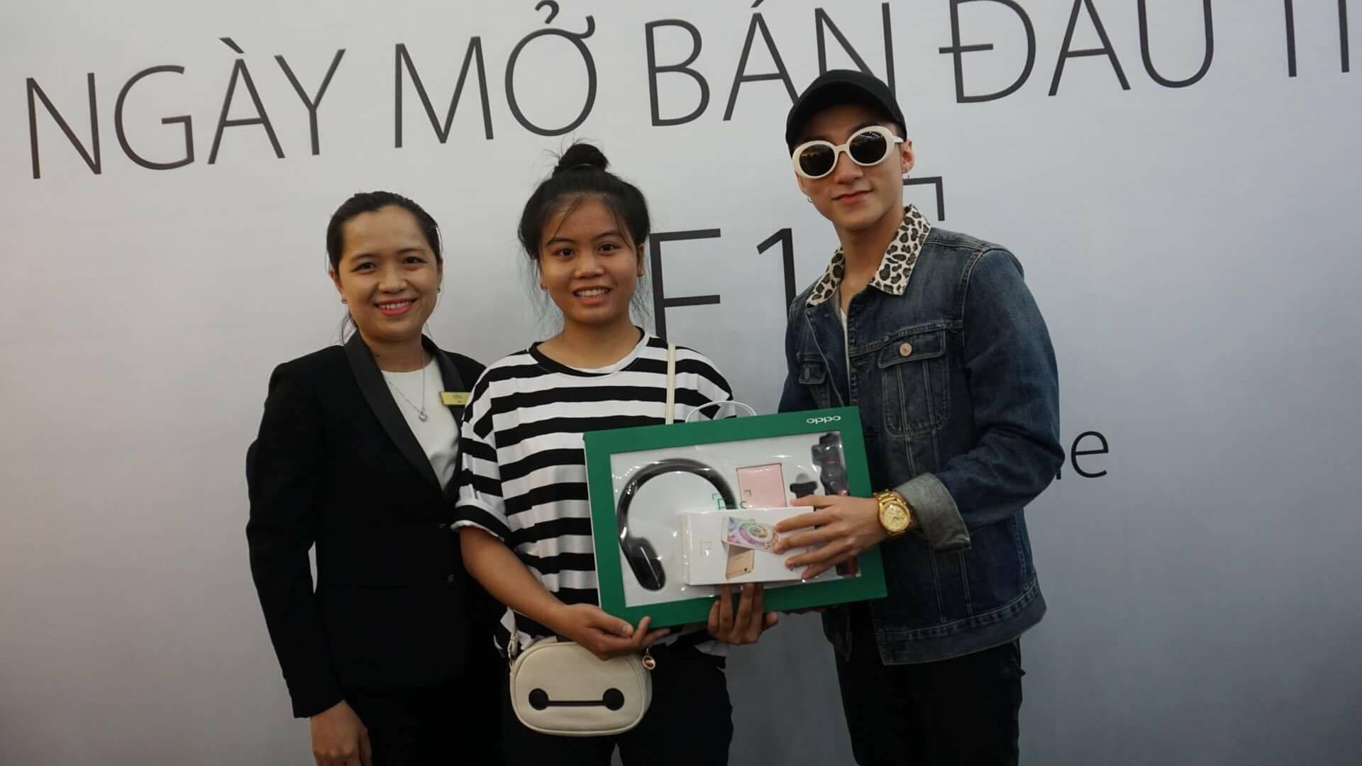Dưới đây là những khách hàng đầu tiên nhận được OPPO F1s cùng bộ quà tặng hấp dẫn đi kèm và họ cũng được chụp ảnh cùng ca sĩ nổi tiếng Sơn Tùng MTP luôn nhé!
