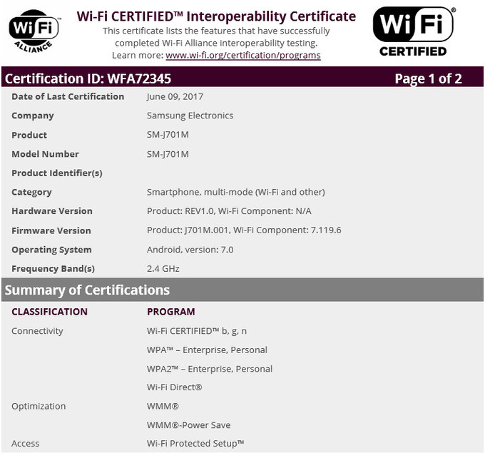 Được biết, Galaxy J7 (2015) chạy Android 5.1 Lollipop khi bán ra, rồi sau đó được cập nhật lên Android 6.0.1 Marshmallow. Những tưởng model này đã hết được Samsung quan tâm tới, nhưng thật bất ngờ với thông tin mà Wi-Fi Alliance đăng tải. Chúc mừng các bạn đang còn dùng Galaxy J7 (2015).