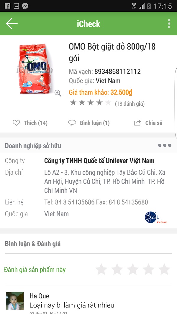 Sau khi ứng dụng nhận ra mã vạch thông tin sản phẩm sẽ hiện ra ngay, bên dưới bạn sẽ xem được những bình luận và đánh giá của người dùng. Như hình dưới mình quét được thông tin của chai C2 có xuất sứ Việt Nam và giá tham khảo là 4.800đ kèm theo địa chỉ liên hệ của công ty sản xuất.