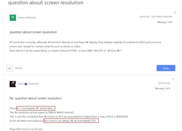 Những người điều hành trên diễn đàn chính thức của Sony cho biết (ảnh chụp màn hình bên dưới), không giống như XZ2 Premium, màn hình 4K trên Xperia 1 không thể hạ độ phân giải xuống 1080p, cho nên hầu hết các giao diện người dùng và ứng dụng đều hiển thị ở độ phân giải 3.840 x 1.644 pixel.