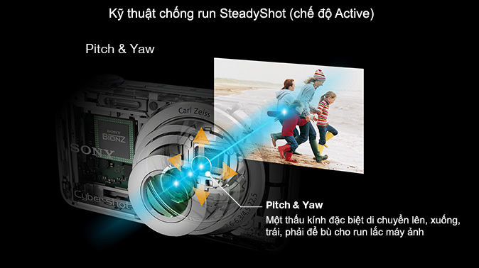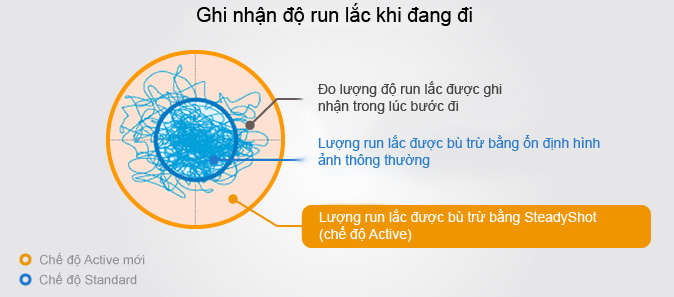 Chú ý: SteadyShot (chế độ Active) chỉ ứng dụng khi quay phim. Hiệu chỉnh run lắc tối đa cho máy ảnh trong lúc bước đi và ghi chính xác nhất tại tiêu cự rộng nhất của ống kính.