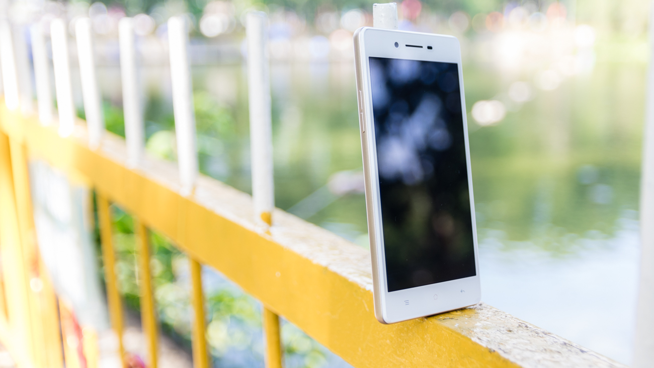 Điểm nhấn đầu tiên là máy có thiết đẹp và sang trọng với một chút gì đó được thừa hưởng từ những người đàn anh cao cấp hơn là OPPO Mirror 5 và R7 Lite. Một tấm kính cường lực phủ toàn bộ mặt trước, mặt lưng bằng nhựa giả kính bóng bẩy, bên hông là viền nhựa mạ kim loại khá sắc sảo, đặc biệt trên phiên bản màu trắng có phần khung viền vàng đồng rất được ưa chuộng hiện nay giúp sản phẩm trở nên nổi bật, mang tính thời trang cao khi cầm trên tay.