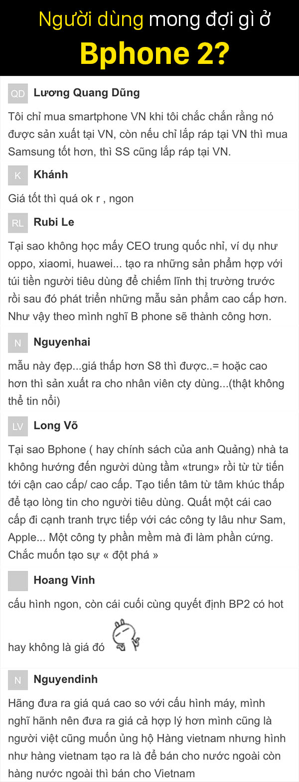 Với việc rất đông bạn đọc của trang Tin Tức Thế Giới Di Động mong muốn BKAV sẽ trình làng Bphone 2. Nhưng người dùng cần giá bán của Bphone hợp lí một chút, cộng với chiến lược nên đi từ phân khúc tầm trung trước rồi mới tới cao cấp để người dùng dần chấp nhận các sản phẩm của công ty này.