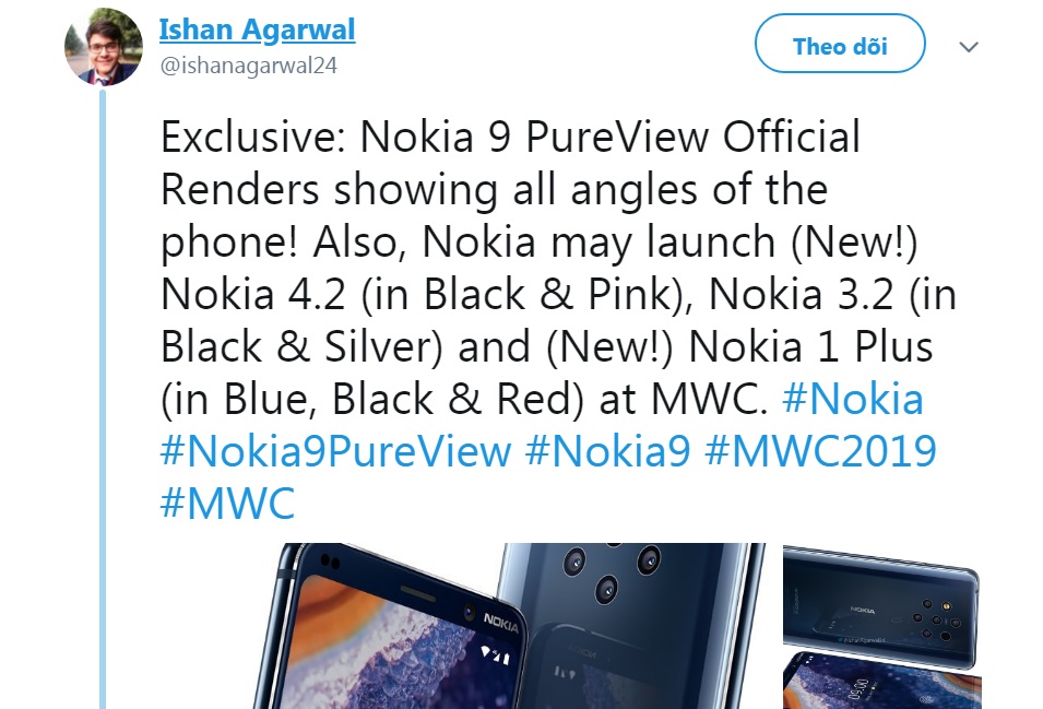 Chỉ còn ít ngày nữa là MWC 2019 sẽ diễn ra ở Barcelona, Tây Ban Nha, và tại đây, HMD Global sẽ trình làng Nokia 9 PureView. Hôm nay ảnh render chính thức của máy đã lộ diện.