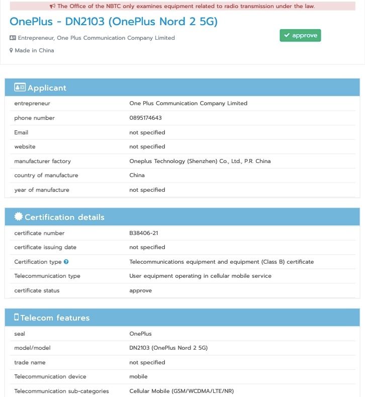 Tuy Geekbench chỉ tiết lộ tên mã của điện thoại là DN2103, nhưng trước đó số model này từng được cơ quan NBTC của Thái Lan xác nhận thuộc về OnePlus Nord 2. Theo đó, Nord 2 sẽ dùng chip Dimensity 1200 AI kết hợp RAM 12 GB (dự kiến có thêm phiên bản RAM 8 GB) và chạy Android 11.