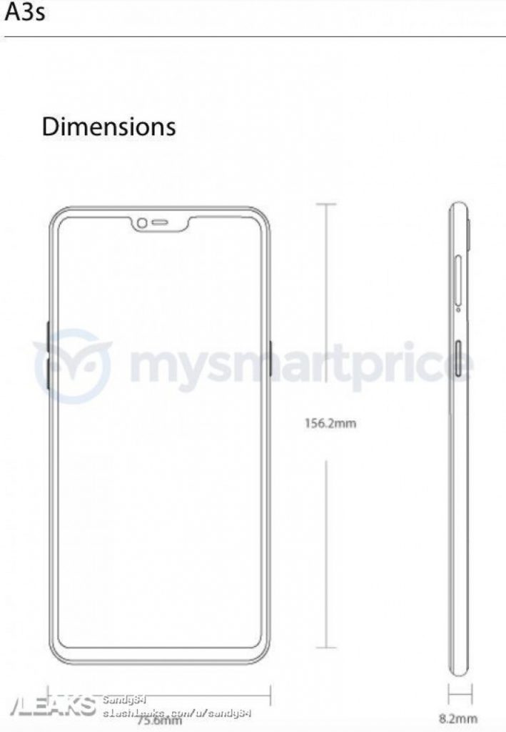 Mới đây thông số kỹ thuật và hình ảnh báo chí của OPPO A3s (bản nâng cấp của OPPO A3) đã bị rò rỉ, với màn hình "tai thỏ" và camera kép nằm ngang phía sau.
