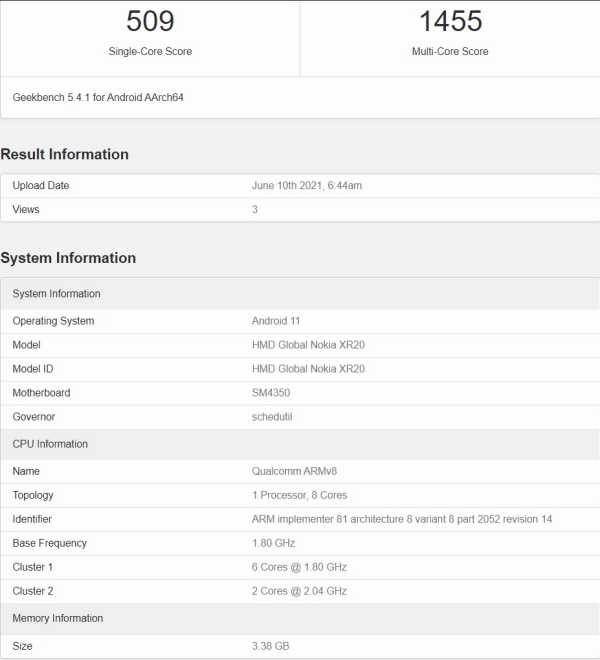 Theo Geekbench, Nokia XR20 chạy Android 11, có 4 GB RAM và song hành cùng Snapdragon 480 5G - đây cũng là con chip được trang bị cho Nokia X10 và X20.