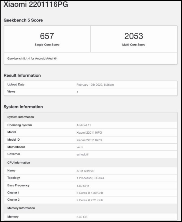 Ở bài kiểm tra đơn nhân, Xiaomi 2201116PG ghi được 657 điểm, còn đa nhân tới 2.053 điểm. Giới thạo tin cho biết, POCO X4 5G có thể là phiên bản cải tiến của Redmi Note 11 Pro 5G.