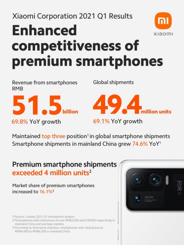 Xiaomi thông báo rằng công ty đã xuất xưởng được hơn 49.4 triệu chiếc smartphone trên toàn cầu trong quý 1/2021, mang về mức tăng trưởng ấn tượng 69.1% so với cùng kỳ năm ngoái. Chưa hết, doanh thu mảng smartphone toàn cầu của hãng cũng tăng lên 51.5 tỷ Yuan.