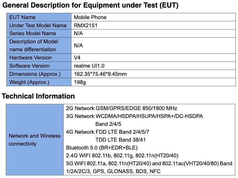 Vào tháng 7 năm nay, Realme RMX2151 đã được cơ quan Wi-Fi Alliance chứng nhận hỗ trợ Wi-Fi 802.11ac, chạy Android 10 và dùng chip MT6785T (Helio G90T) của MediaTek. Chiếc điện thoại này cũng từng được chứng nhận bởi cơ quan TKDN của Indonesia và Ủy ban Kinh tế Á-Âu (EEC) ở Nga.
