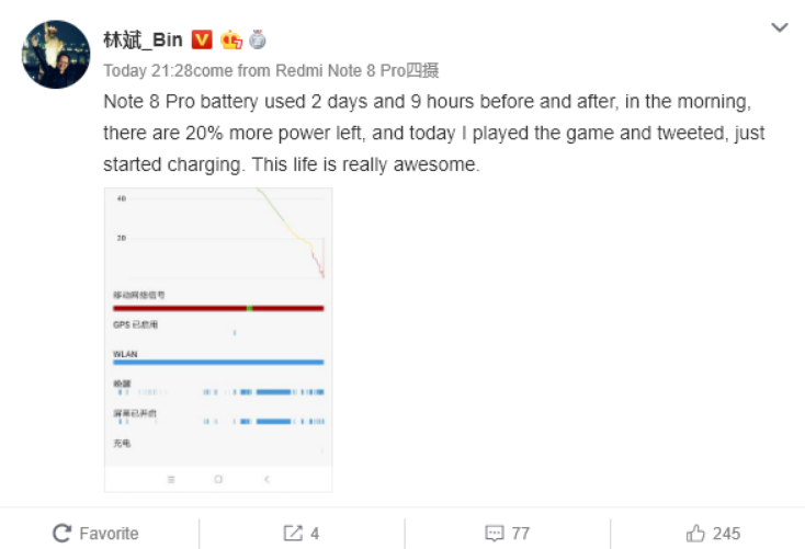 Sau mấy ngày trải nghiệm, Chủ tịch của Xiaomi, Lin Bin đã chia sẻ ảnh chụp màn hình quá trình sử dụng pin của Redmi Note 8 Pro lên Weibo. Ông cho biết Redmi Note 8 Pro có thể hoạt động tới 2 ngày 9 giờ và vẫn còn 20% pin - tức đã dùng 80% pin.