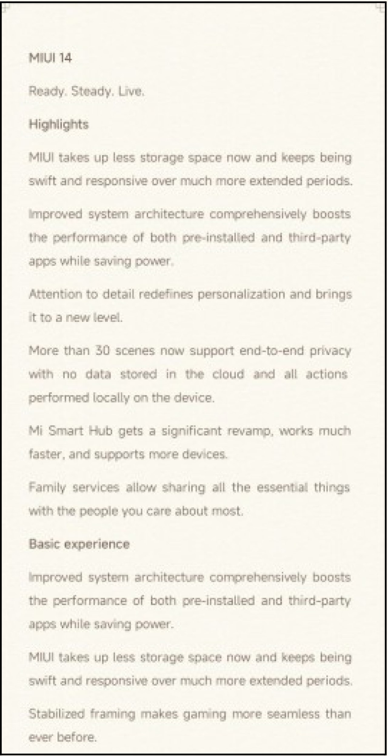 MIUI 14 cải tiến hệ thống kiến trúc với các ứng dụng được cài đặt sẵn chiếm ít dung lượng hơn, "ăn" ít pin hơn dẫn đến hiệu suất tốt hơn. Người dùng cũng sẽ tìm thấy nhiều tùy chọn cá nhân hóa hơn với định dạng widget hoàn toàn mới, thư mục màn hình chính và “Siêu biểu tượng”.