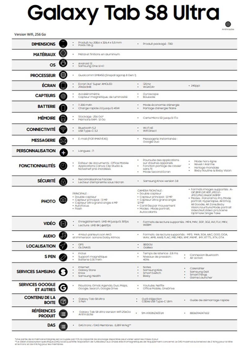 Ngoài ra, chi tiết phần cứng của Galaxy Tab S8 series cũng đã được hé lộ nhưng lần này là từ Pháp. Với những ảnh chụp màn hình mới này, trong trường hợp đã bỏ lỡ những rò rỉ lớn trước đó, bạn có xem ngay các hình ảnh tại albumn bên dưới để xem kỹ hơn tất cả các thông số kỹ thuật của thiết bị.