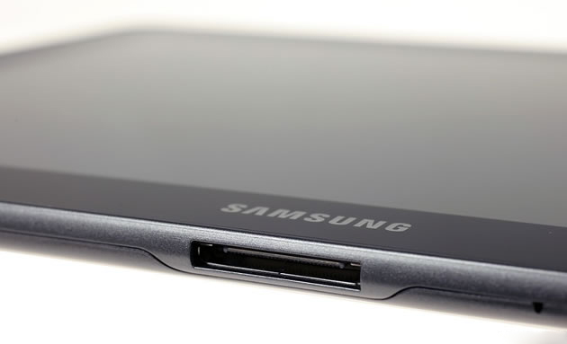 Samsung Galaxy Note 10.1 dùng kết nối 30-pin để sạc và kết nối. Khu vực này nằm dưới tablet.