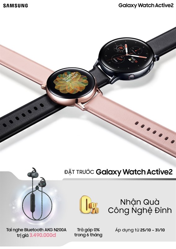 Người dùng có thể đặt trước Galaxy Watch Active2 tại các đại lý, cửa hàng phân phối chính thức của Samsung, trang bán trực tuyến của Samsung và các cửa hàng trải nghiệm sản phẩm Samsung từ ngày 25/10 đến 31/10/2019 để sở hữu quà tặng Tai nghe Bluetooth AKG N200A trị giá 3.490.000 đồng. Sản phẩm sẽ được chính thức mở bán từ ngày 1/11/2019. Galaxy Watch Active2 có hai tùy chọn màu sắc bao gồm Vàng Hồng và Đen; hai phiên bản chất liệu Nhôm và Thép cho cả hai kích thước 40 mm và 44 mm và phiên bản giới hạn Under Armour 44 mm.