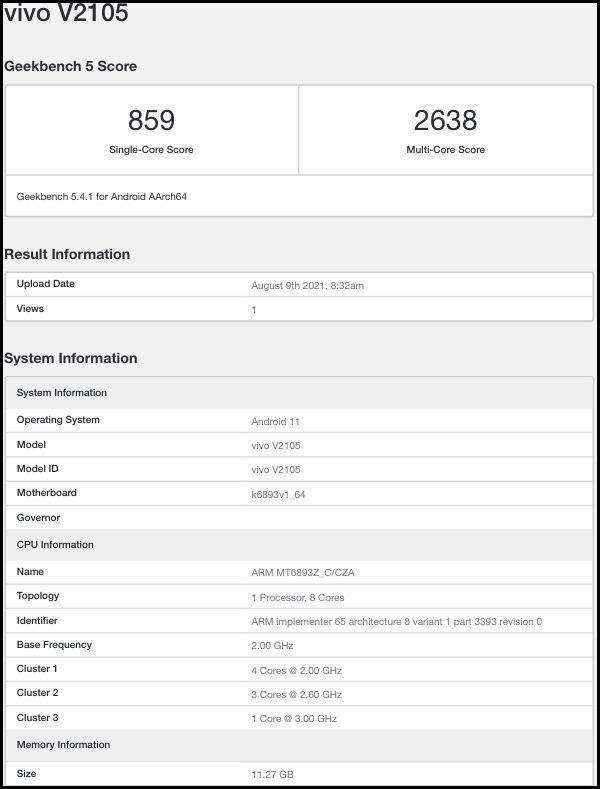 Thiết bị Vivo V2105 liệt kê trên Geekbench được cho là số model của Vivo X70 Pro và dùng chip MediaTek Dimensity 1200 - đây cũng là bộ vi xử lý dự kiến được trang bị cho Vivo X70 tiêu chuẩn.