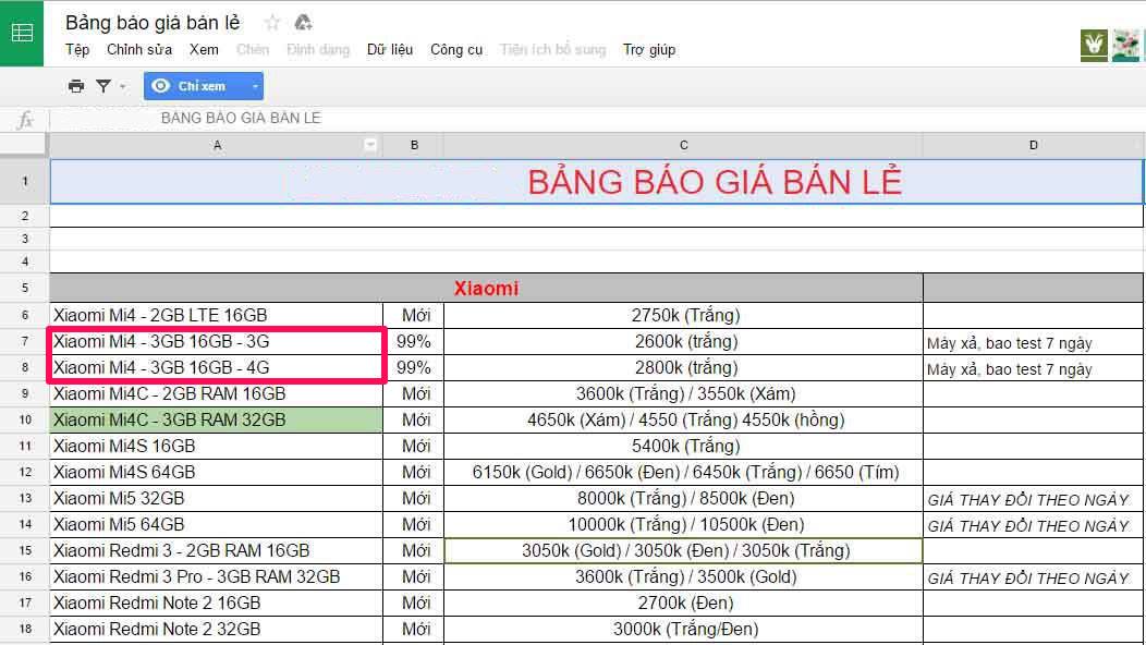 Lấy ví dụ một mẫu flagship từ 2014 là Xiaomi Mi 4 (chạy snapdragon 801, RAM 2 GB), với giá trên store của hãng là 1.290 nhân dân tệ (xấp xỉ 4,6 triệu tiền Việt Nam) nhưng các cửa hàng ở Việt Nam bán mẫu này với giá dao động từ 2,7 - 3,5 triệu, rẻ hơn hẳn 1 triệu so với Trung Quốc.