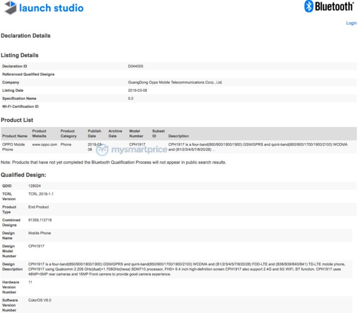 Model này có mã sản phẩm là CPH1917, hiện đã được chứng nhận bởi cơ quan IMDA tại Singapore và tổ chức Bluetooth SIG.