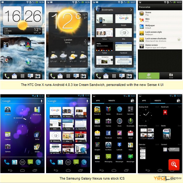 Về phần mềm và hệ điều hanh, One X và Galaxy Nexus tương tự như nhau.Các điểm tương đồng đó được giải thích là cả hai thiết bị đều chạyAndroid 4.0 Ice Cream Sandwich. Tuy vậy, phần giao diện người dùng đã cómột chút thay đổi, như One X sử dụng HTC Sense UI 4.0đặc trưng của HTC, trong khi Nexus sử dụng giao diện mặc định của ICS4.0. Nhìn chung mỗi cái có một vẻ đẹp và sự tiện lợiriêng, chúng tôi sẽ không tranh luận giao diện người dùng nào tốt hơn,điều đó phụ thuộc vào cảm nhận và cách trải nghiệm riêng của từngngười.