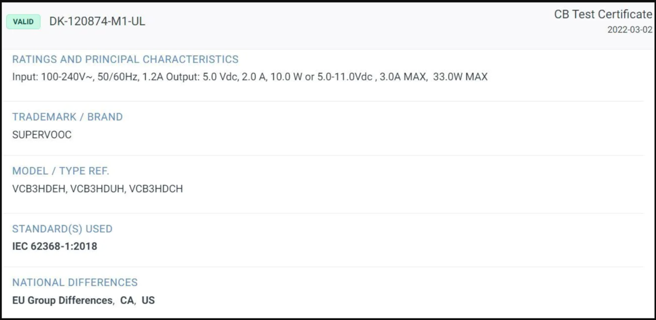 Bộ sạc nhanh của realme 10 có số model VCB3HDUH cũng đã được tìm thấy trên cơ sở dữ liệu của FCC với công suất sạc là 33 W.