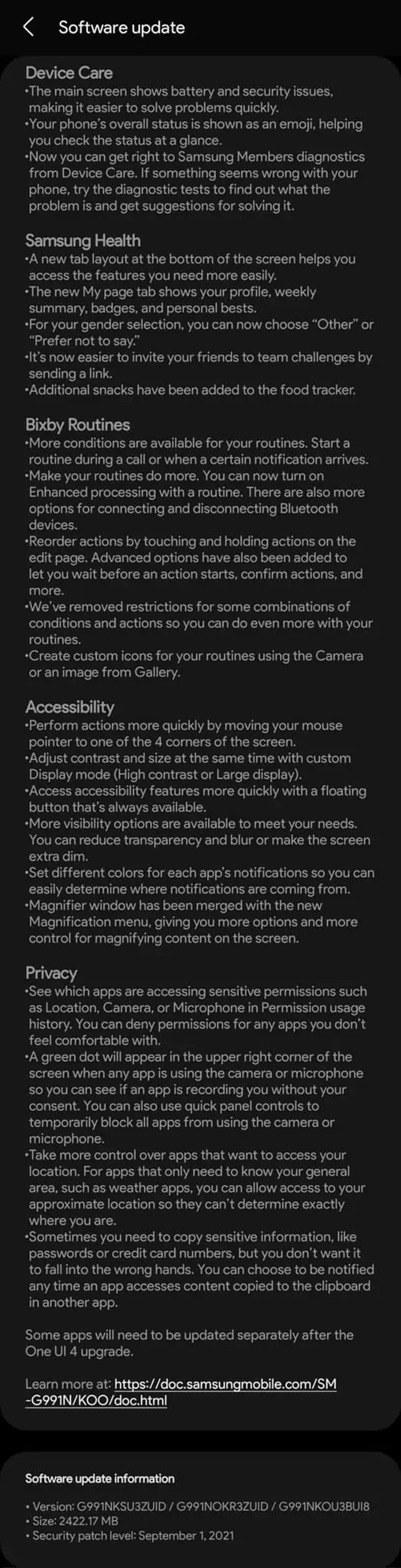 Công ty Hàn Quốc cho biết One UI 4.0 tập trung nhiều vào quyền riêng tư và nâng cao cảm giác trải nghiệm cho người dùng, ngoài ra cũng bổ sung nhiều tính năng mới liên quan đến giao diện, trợ năng và đặc biệt là máy ảnh.