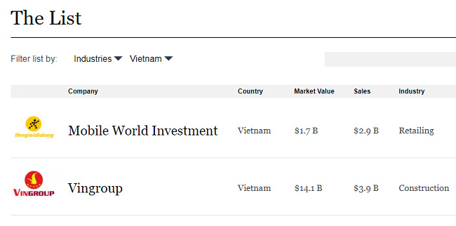 Tạp chí Forbes nêu tên hai công ty của Việt Nam là Thế Giới Di Động và Tập đoàn Vingroup đã được vinh danh Top 50 doanh nghiệp đại chúng hàng đầu khu vực Châu Á (Asia’s Fab 50 2018). Tập đoàn Hòa Phát và Hãng hàng không Vietjet trong số các công ty tiềm năng gia nhập danh sách 50 doanh nghiệp hàng đầu khu vực Châu Á trong các năm tới.