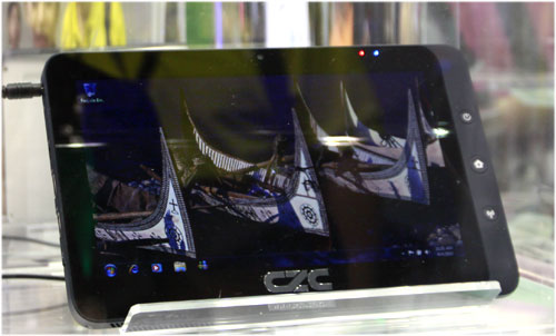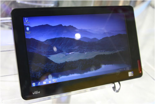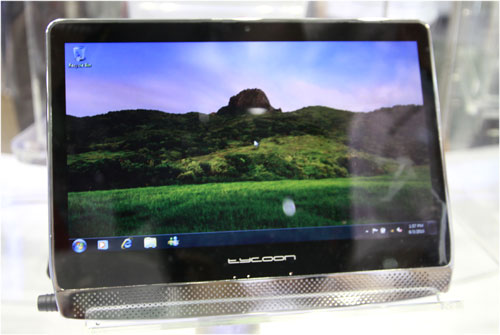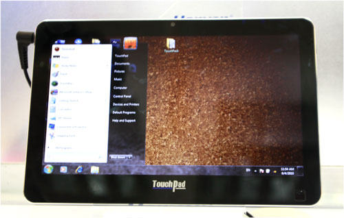 | Máy tính bảng mang tên TouchPad của hãng Hanvon, sử dụng chip Intel Celerom ULV 743 (1,3Ghz), hệ điều hành Windows 7, RAM DDR2 2GB, HDD 250GB. Máy này màn hình 10 inch, Led backlight, webcam 1,3 Megapixel và nặng chưa tới 1kg. |