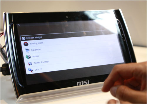 | MSI mang tới triển lãm mẫu máy tính bảng tên Wind Pad với hai lựa chọn hệ điều hành - Windows 7 hoặc Android. Trong hình là model sử dụng Android 2.2, màn hình 10 inch, dày 16,6 mm. |