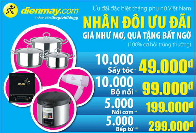 2. Đơn hàng lớn hơn 1000.000 đồng khách hàng được mua máy sấy tóc Carez HDC-3133P với giá 49.000 đồng hoặc nồi cơm điện Kangaroo-KG25 với giá 199.000 đồng.