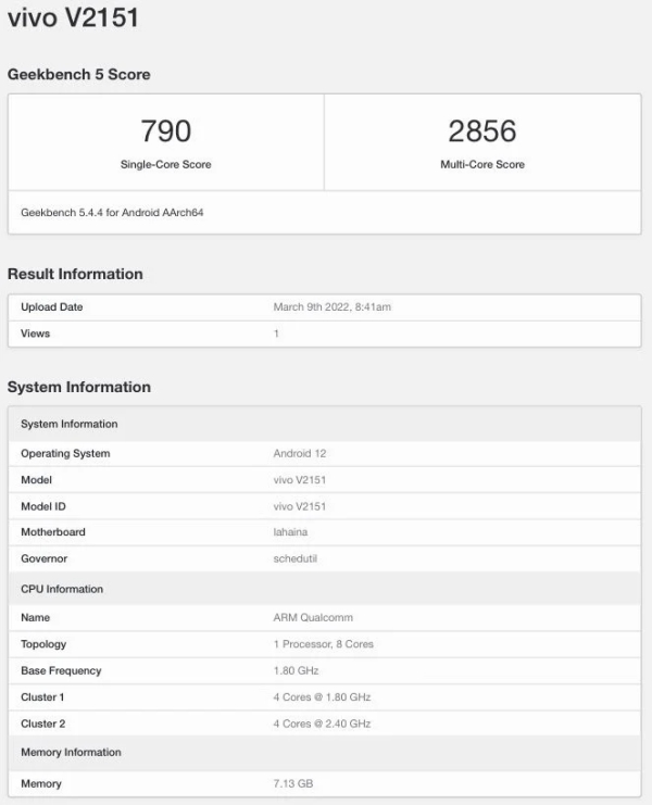 Theo Gizmochina, chiếc smartphone có số model V2151 trên Geekbench 5 được cho là Vivo T1 Pro 5G, ghi được 790 điểm ở bài kiểm tra đơn nhân, còn đa nhân tới 2.856 điểm.