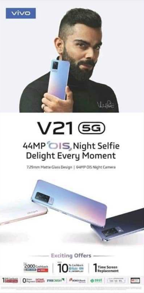 Theo poster, Vivo V21 5G sẽ mỏng 7.29 mm, mặt lưng được phủ kính và có ba tùy chọn màu sắc: Đen, xanh và trắng bạc. Điện thoại có camera trước 44 MP hỗ trợ chống rung quang học (OIS).
