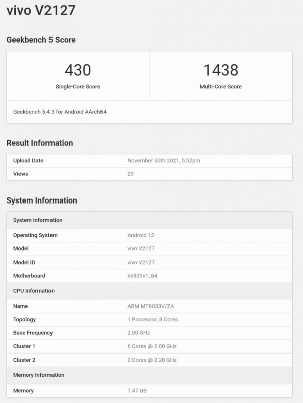 Theo leaker Sudhanshu, số model của Vivo Y55 5G được phát hiện trong cơ sở dữ liệu IMEI là V2127 và khi kiểm tra trên Geekbench có được thông số như sau: Dùng chip MT6833V/ZA (tên mã của Dimensity 700), RAM 8 GB và chạy Android 12.