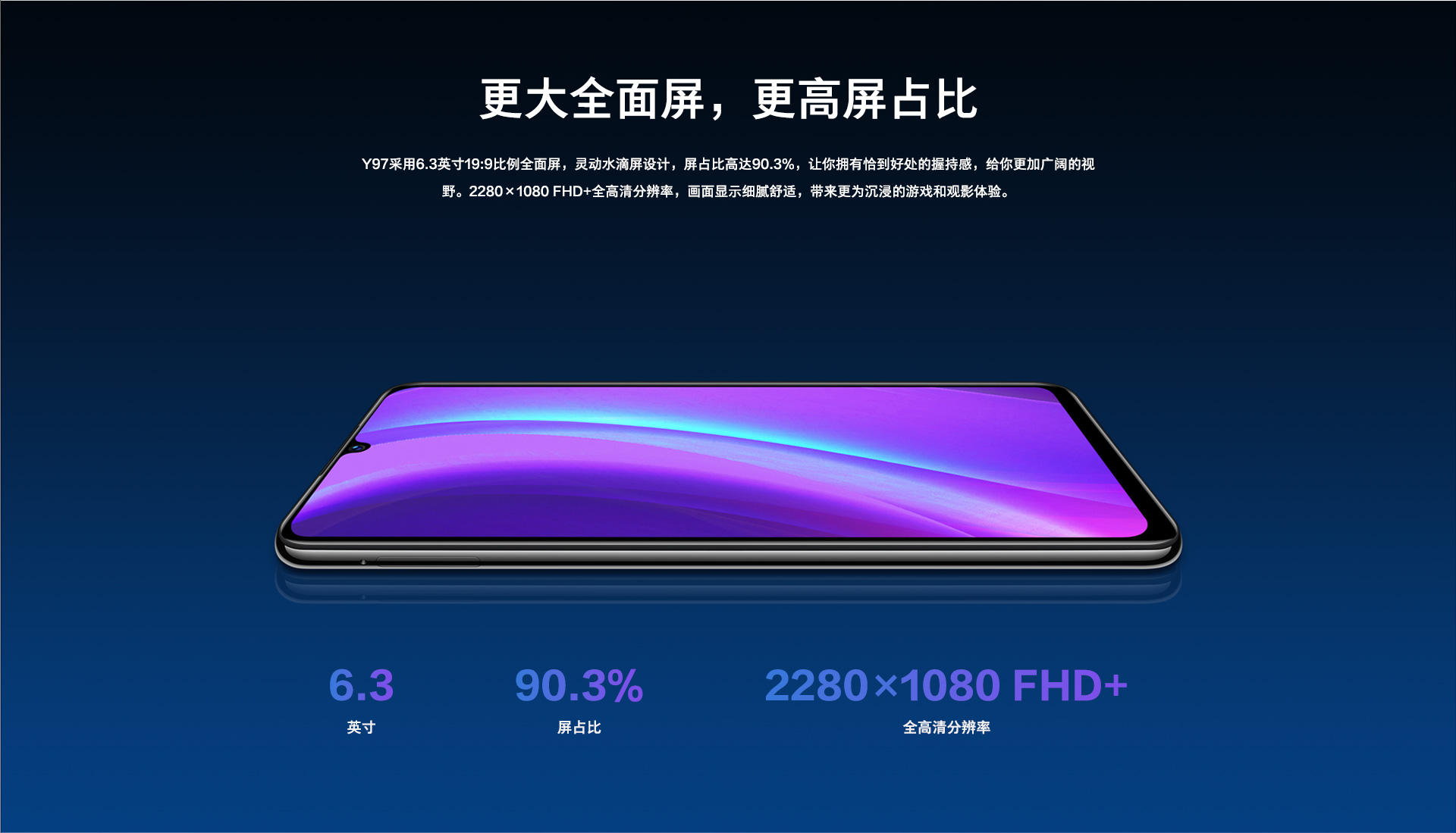 Chiếc smartphone này có màn hình "giọt nước" Super AMOLED Full HD+ 6.3 inch, tỉ lệ khung hình 19:9, tỉ lệ màn hình chiếm đến 90.3% so với diện tích mặt trước. Vivo Y97 dùng chip 8 nhân Helio P60 của MediaTek, RAM 4 GB, ROM 128 GB (hỗ trợ microSD tới đa 256 GB).