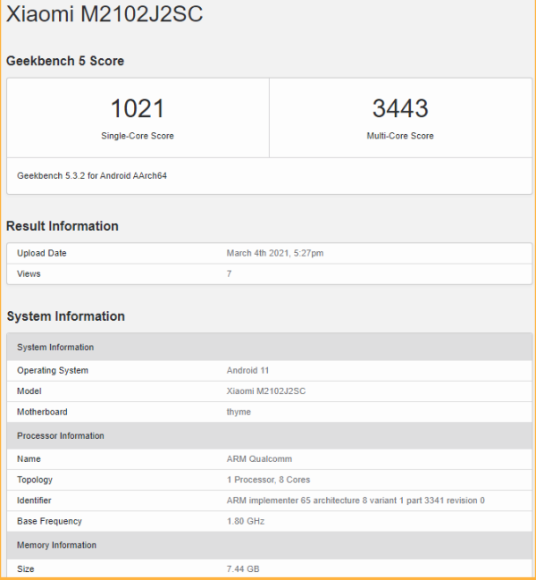 Xiaomi Mi 10 5G ghi được 1.021 điểm ở bài kiểm tra đơn nhân trên Geekbench và đa nhân tới 3.443 điểm. Danh sách cho thấy các thông số kỹ thuật chính của Mi 10 5G, bao gồm dùng chip Qualcomm Snapdragon 870, RAM 8 GB và chạy hệ điều hành Android 11. Mã nguồn Geekbench tiết lộ tân binh này song hành cùng GPU Adreno 650.