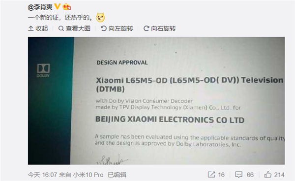 Đầu ngày hôm nay (28/4/2020), Tổng Giám đốc bộ phận Truyền hình của Xiaomi đã chia sẻ một hình ảnh trên tài khoản Weibo chính thức, mô tả chiếc TV có tên L65M5-OD vừa đạt chứng nhận Dolby Vision, hỗ trợ truyền hình số mặt đất DTMB và được công ty điện tử TPV Display gia công.