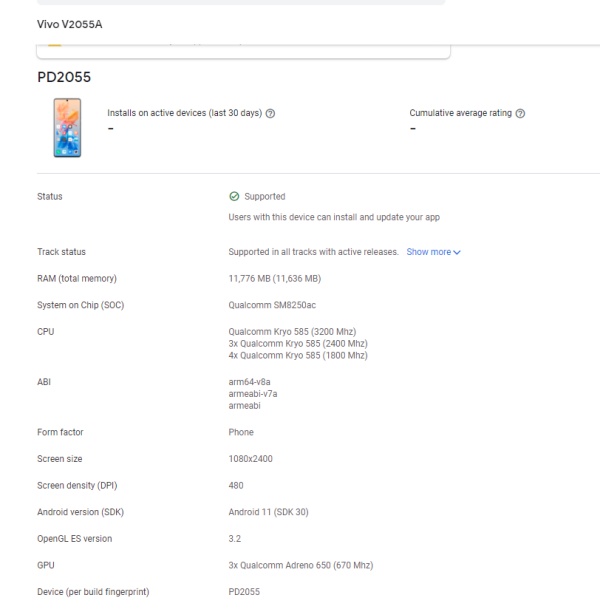 Sau đó, có tin đồn rằng cả OPPO và Xiaomi cũng sẽ tung ra thị trường những chiếc smartphone mới chạy chip Snapdragon 870. Ngay bây giờ, một chiếc smartphone Vivo bí ẩn với số hiệu V2055A đã xuất hiện trên Google Play Console, tiết lộ dùng chip Snapdragon 870.