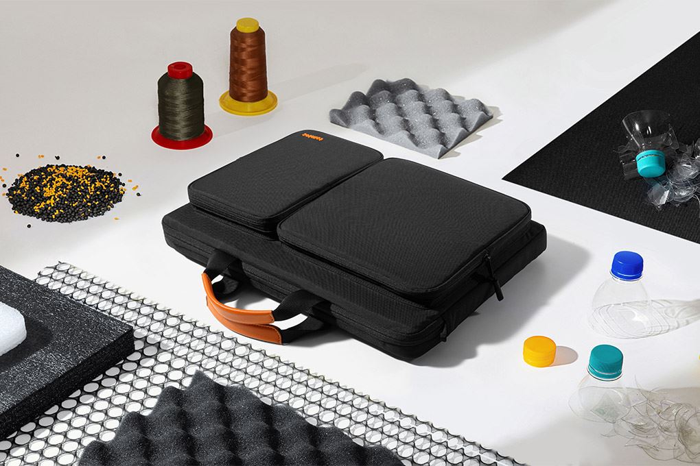 Bên trong, sản phẩm được lót bằng lớp vải nhung mềm mịn, kết hợp cùng lớp đệm bảo vệ giúp hạn chế tối đa trầy xước bề mặt laptop và các thiết bị điện tử khác. Điều đặc biệt hơn, toàn bộ vải được làm từ vật liệu tái chế thân thiện với môi trường, thể hiện cam kết của Tomtoc trong việc hướng đến lối sống xanh và bền vững.
