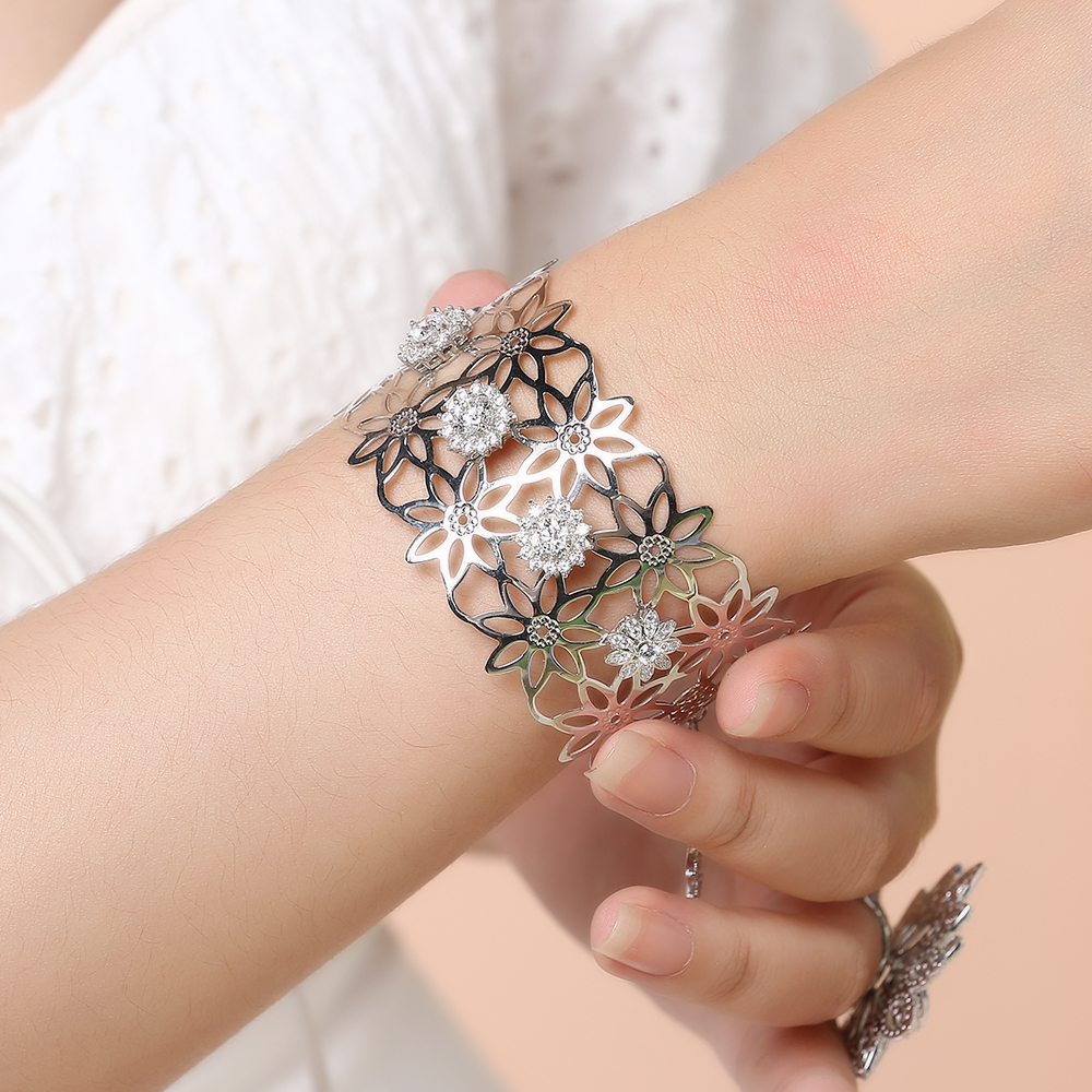 Vòng tay bạc nữ AVAJi đính đá xi trắng AVAJ.T000094 được tạo nên từ những chi tiết bông hoa nhỏ nối ghép với nhau, thiết kế dạng bản rộng giúp che đi khuyết điểm thô, gầy ở phần cổ tay nhỏ. Vòng tay sử dụng chất liệu bạc 925 có độ bền tốt và vẻ ngoài sáng bóng nổi bật được ưa chuộng trong ngành trang sức, sắc bạc tinh tế cùng vẻ đẹp lấp lánh của những viên đá CZ được đính xung quanh là sự kết hợp hoàn hảo giúp tôn lên làn da trắng hồng gợi cảm, thu hút mọi ánh nhìn.